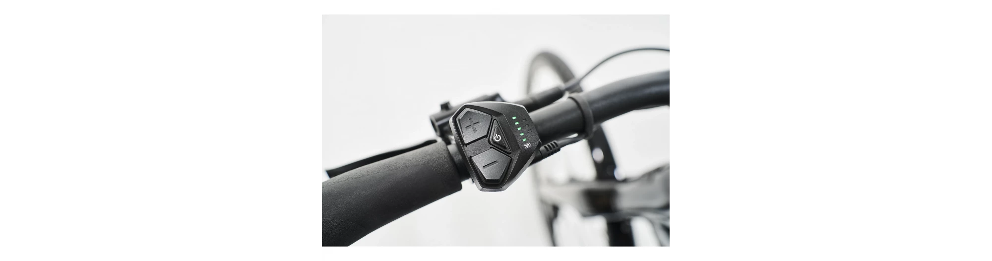 - Vous contrôlez votre vélo électrique avec votre main gauche via une petite télécommande. Les LED vous donnent des informations sur l’état de la batterie et le niveau d’assistance électrique.