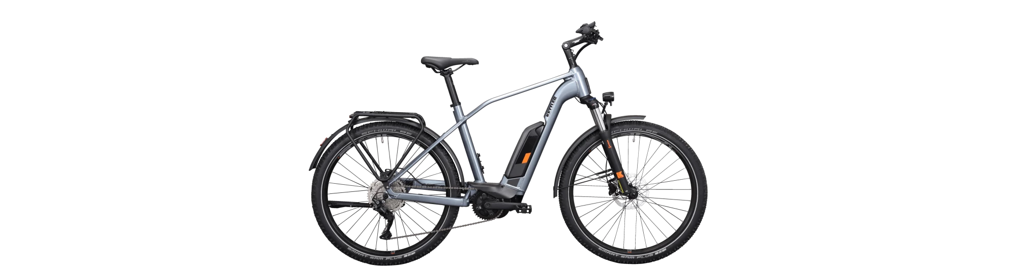 Avec la motorisation équilibrée du moteur Bosch Performance Line, l’ESCARO TOWN & COUNTRY porte bien son nom : lors des trajets quotidiens en ville et des excursions, ce vélo offre une assistance harmonieuse et puissante, tandis que sa fourche suspendue avec un débattement de 80 mm et son dérailleur 10 vitesses réactif lui confèrent son caractère sportif. Les roues de 27,5 pouces, combinées à de larges pneus à crampons, offrent une maniabilité et une traction souple et amortissent les vibrations. La batterie de 500 Wh présente sur les cadres diamant et wave est facile à retirer ; l’attelage K-Link intégré pour une remorque pour enfants et le porte-bagages MonkeyLoad facilitant la fixation de sacoches et de paniers sont tout aussi pratiques.