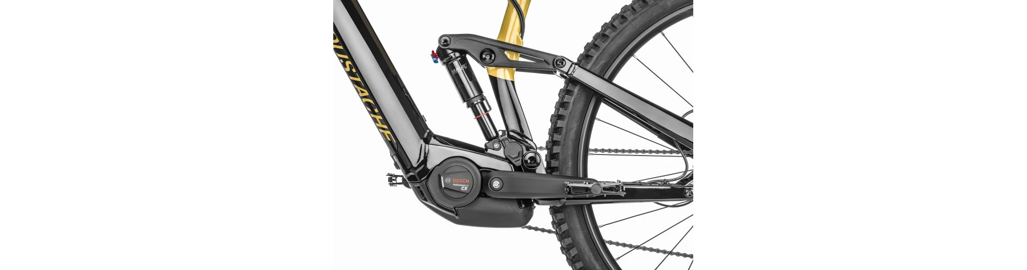 - Amortisseur à air Moustache Magic Grip Control offrant 160 mm de débattement, un contrôle dynamique du rebond, pour un confort de pilotage combinée à une traction épatante.
