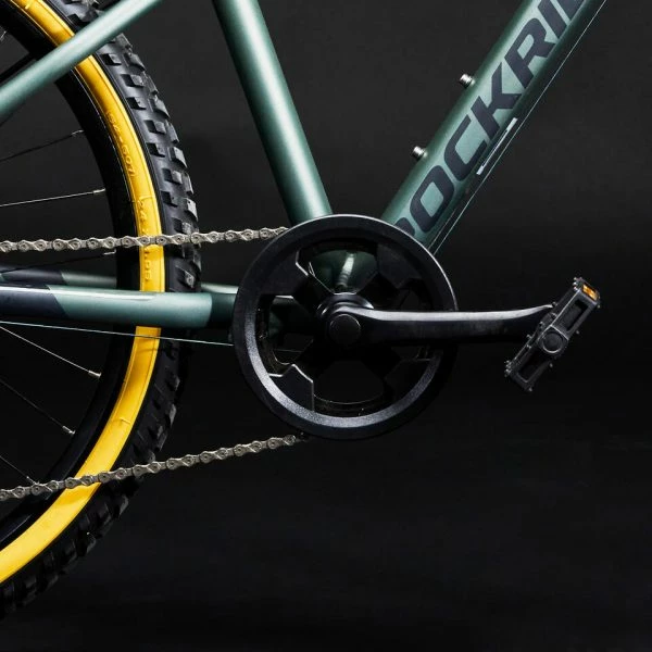 Ce VTT est équipé d’une sonnette, d’éclairages, de catadioptres de roues (réflecteurs) et de pédales plates.